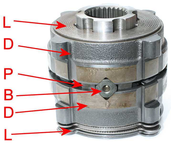 Bild 2 zeigt den Inhalt des Gehäuses, dieser besteht aus 2 Druckringen (D), deren Nasen (jeweils 4) vom Gehäuse angetrieben werden. Die Druckringe (D) können sich im Gehäuse axial verschieben. Über einen V-förmigen Einschnitt geben sie die Kräfte an den Differenzialbolzen (B) weiter, der hier (siehe Bild 3) ein rechteckiger Träger für 4 Ausgleichskegelräder (Planetenräder, P) ist. An den Enden werden die Lamellen (L) angebracht, von denen je zwei über Nasen (jeweils 4) vom Gehäuse (Bild 1) mitgenommen werden und je zwei (eine davon ist oben zu sehen), die in den Nuten eines Kegelrades (oben) mitgenommen werden.