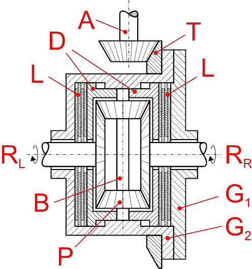 Bild 6 zeigt noch einmal eine Schnittdarstellung durch ein Lamellensperrdifferenzial, wobei hier der Einfachheit halber nur ein Differenzialbolzen (B) mit zwei Ausgleichskegelrädern (P) angenommen wurde. Neben den in Bild 2 verwendete Bezeichnungen ist hier noch das zweiteilige Gehäuse (G1, G2), der Abtrieb zu den Rädern (RL, RR) und der motorseitige Antrieb (A) über ein Kegelrad und ein Tellerrad (T) eingezeichnet.