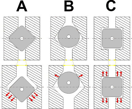 Die Kerbe läßt sich jedoch auch ungleichmäßig ausführen (B), so dass in der gezeigten Richtung (nach oben) höhere Sperrwerte erreichbar sind, als in die andere Richtung. Bei dieser Ausführung muss man beim Zusammenbau beachten, dass das Innenteil (Bild 2) nicht verkehrt herum in das Gehäuse (Bild 1) eingebaut wird.