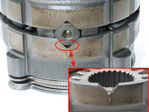 Bild 4 zeigt, wo der Sperrwert beeinflusst wird: Die Druckringe übertragen Kräfte auf den Differenzialbolzen. Durch dessen Form wirkt die Kraft aber wieder zurück auf die Druckringe und schiebt diese zurück, so es für die Lamellen zwischen Druckring und Gehäuse (Bild 1) eng wird und so die gewünschte Sperrwirkung erzielt wird. Die Kerbe der Druckringe und die Form des Differenzialbolzens bestimmen nun, wie groß das Sperrmoment wird.