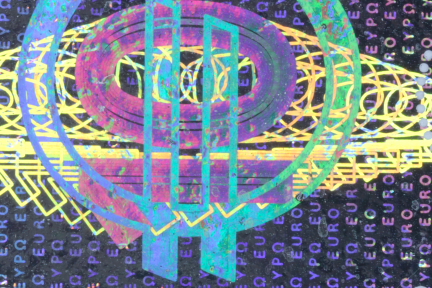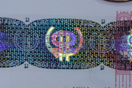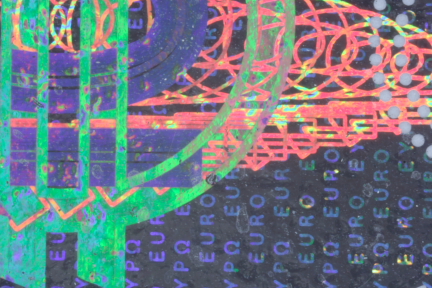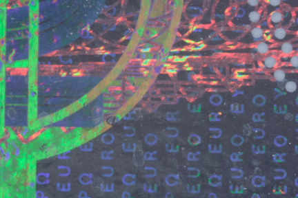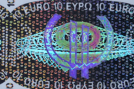 Der Ausschnitt aus der 10 € Banknote zeigt den silbernen Streifen mit dem Hologramm auf der Vorderseite rechts. Die Farben wechseln durch den wechselnden Abstand/Blickwinkel auf das Hologramm im Alustreifen der Banknote, der Effekt ist also durch das Motiv begründet.