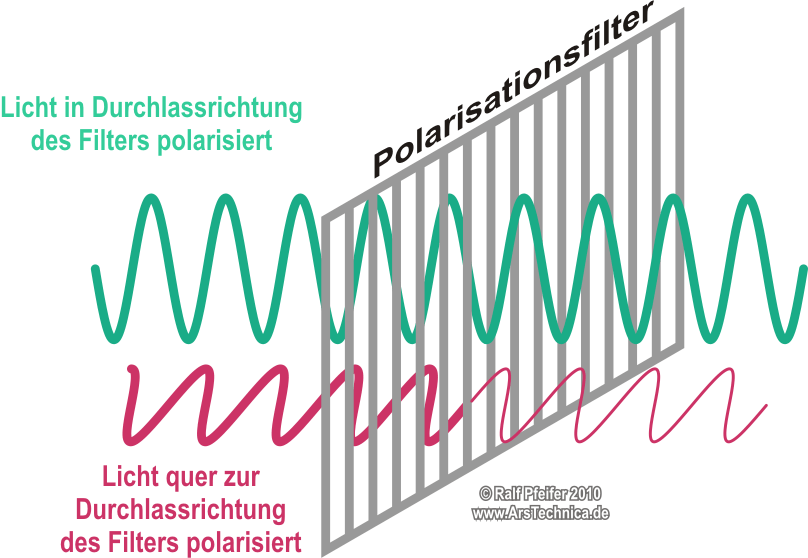 Vergleichbar ist das mit einer Münze (analog: Lichtwelle) die auf einen Fahrkartenautomaten trifft. Nur wenn die Münze wie der Schlitz (analog: Polfilter) ausgerichtet ist, schafft sie es in den Automaten. Hält man die Münze falsch, gibt es keine Fahrkarte!