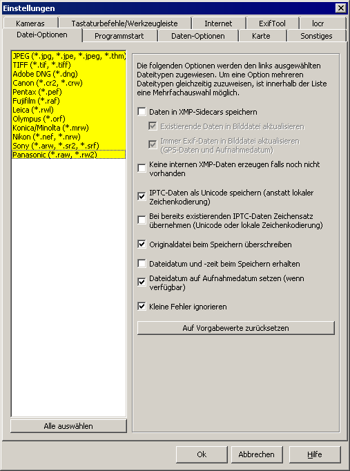 Zunächst wird im Menü 'Datei' → 'Einstellungen', Register 'Datei-Optionen' wenigstens der Typ der eigenen Kamera (bei mir 'Canon (*.cr2, *.crw2)') markiert. Besser ist es, alle Dateitypen zu markieren, um in jedem Falle immer die gleiche Behandlung aller Bilddateien sicherzustellen.