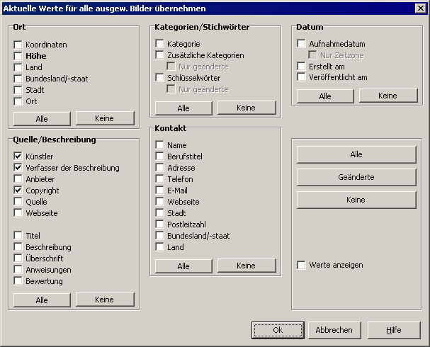 Auf die Schaltfläche 'Aktuelle Werte für alle ausgew. Bilder übernehmen...' klicken, um den folgenden Dialog zu erhalten: