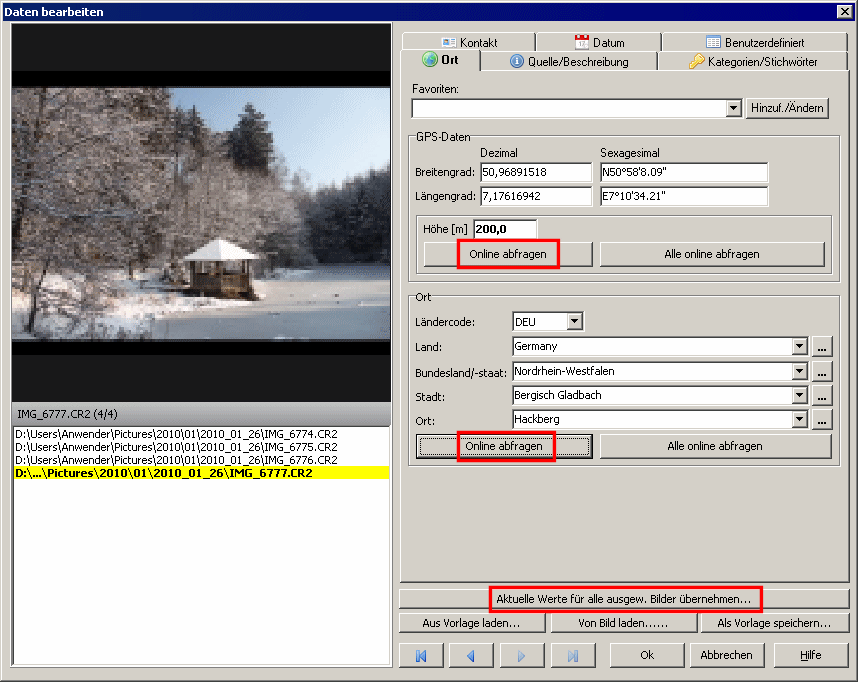 Über die beiden Schaltfläche 'Online abfragen' können die entsprechenden Ortsdaten automatisch aus dem Internet bezogen werden, mit 'Alle Online abfragen' werden gleich alle markierten Bilder bearbeitet.