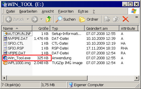 Wenn der Easy Showily an den Rechner mit Windows-Betriebssystem angeschlossen wird, meldet er sich als ganz normaler USB-Memorystick, der schon ein paar Dateien enthält. Zu diesen Dateien gehört auch das Programm Win_Tool.exe (Bild 2, rot umrandet). Dieses ermöglicht es, auf jedem Rechner und ohne Installation von Treibern sofort