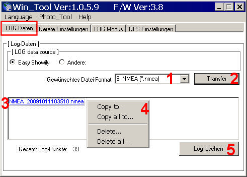 Ist Win_Tool.exe gestartet und befinden sich Daten auf dem Logger, so sollten diese gesichert werden. Bild 7 zeigt, wie im Register ‘LOG Daten’ das Dateiformat zu wählen ist (1), hier wurde das NMEA-Format für die Ausgabe der GPS-Daten gewählt.