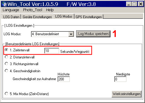 Bild 5 zeigt weitere Einstellungen zur Aufnahmezeit. Im LOG-Modus ‘Benutzerdefiniert’ wird nur ein Zeitintervall (hier 10 s) vorgegeben, damit kontinuierlich Daten aufgezeichnet werden. Durch klicken von (1) wird die Einstellung wirksam.
